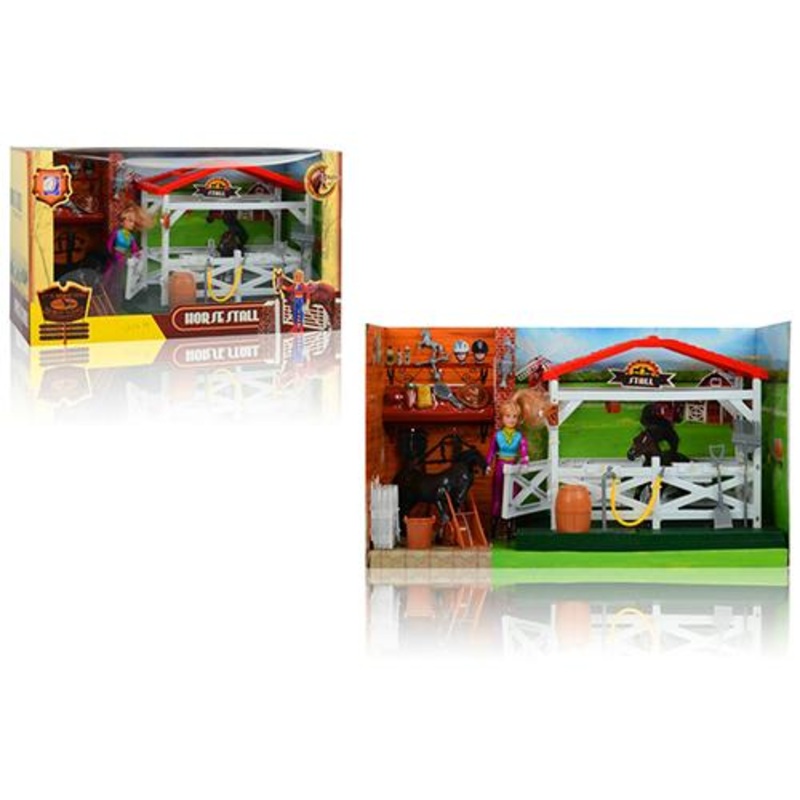 5566 Horse StallSet consists of a horse and his jockey.A stable and it's equipment.This is another plasticproduct under EU Regulations.Colour may vary from illustartion.Box Measures :16cm X 43cmAge Group: 3 years & Up