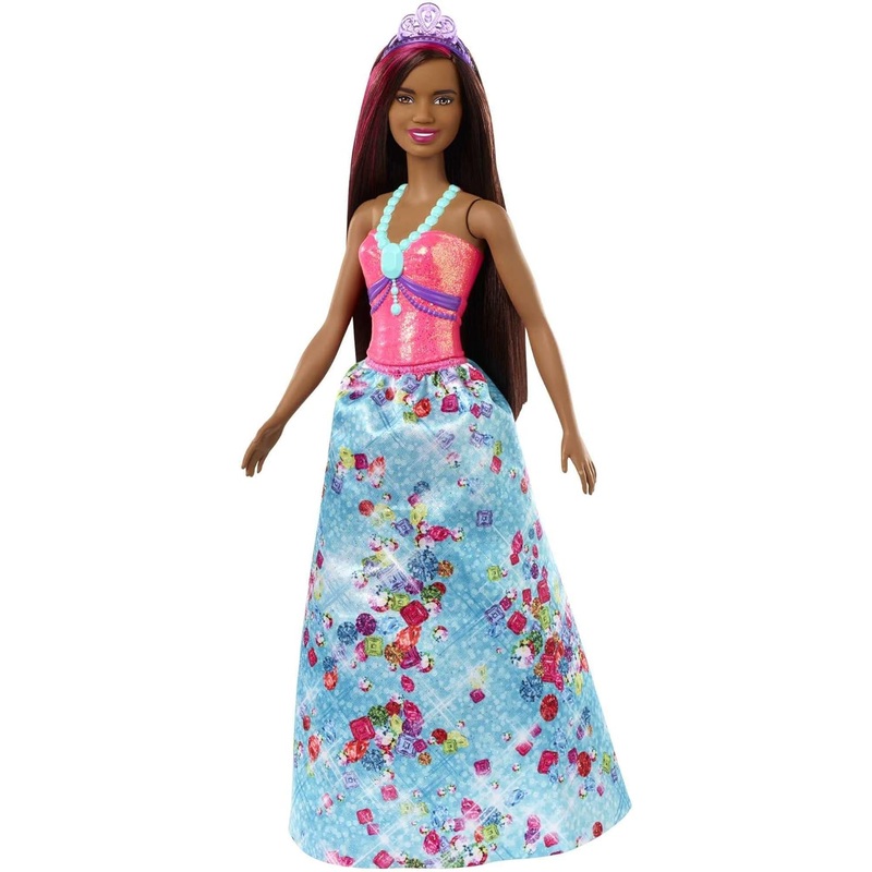 - This royal doll from Barbie Dreamtopia wears a sparkly bodice and colorful skirt with a jewel-inspired print.